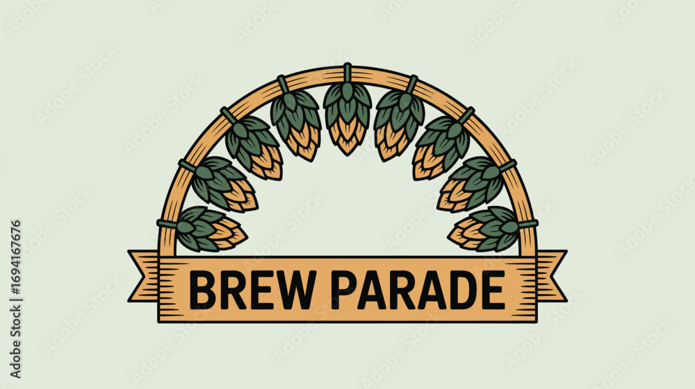 A brew parade logo featuring hops arranged in a semi circle with a banner on a light background #1694167676