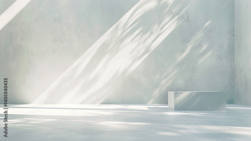 A bright, empty, modern presentation space with light streaming through, featuring a simple white display podium. #1406840433