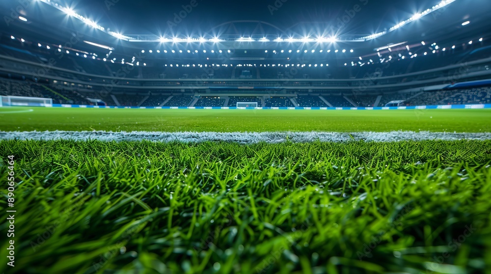 A brightly lit soccer stadium highlighting freshly manicured green grass under the floodlights at night, capturing the essence of a grand sports arena ready for action. #890656464