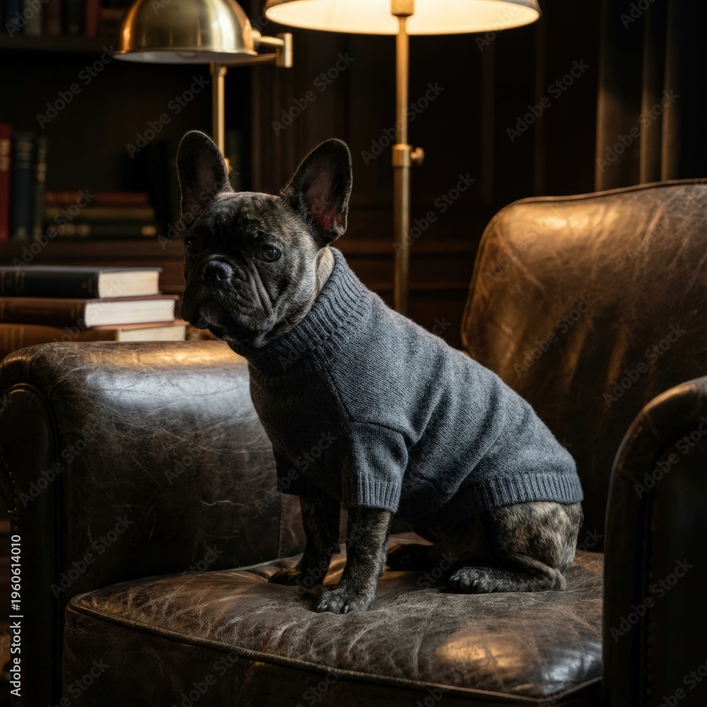 A brindle French Bulldog in a grey sweater sits on a leather chair in a cozy library. #1960614010