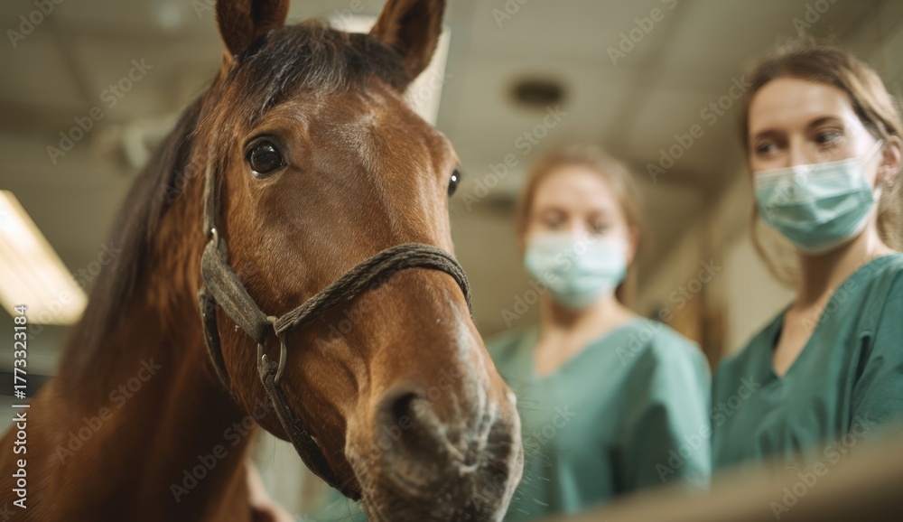 A brown horse is being examined by two medical professionals wearing surgical masks in a well-lit room. #1773323184