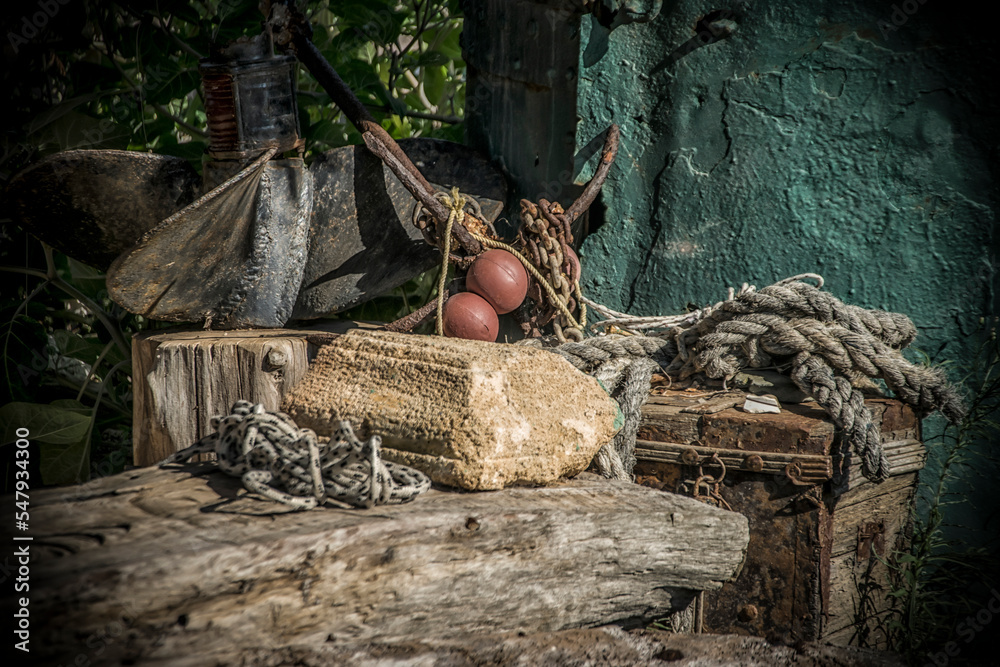 A bunch of old fishermen tools in a yard #547934300