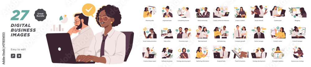 A bundle of 27 editable vector illustrations showing digital business concepts like content creation, planning, teamwork, and online promotion. #1718316133