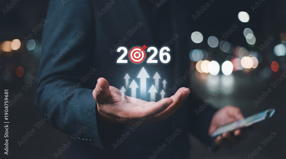 A business professional holding a smartphone with a futuristic target of 2026 and upward arrows symbolizing growth, strategy, and success in a night cityscape. #1904759681