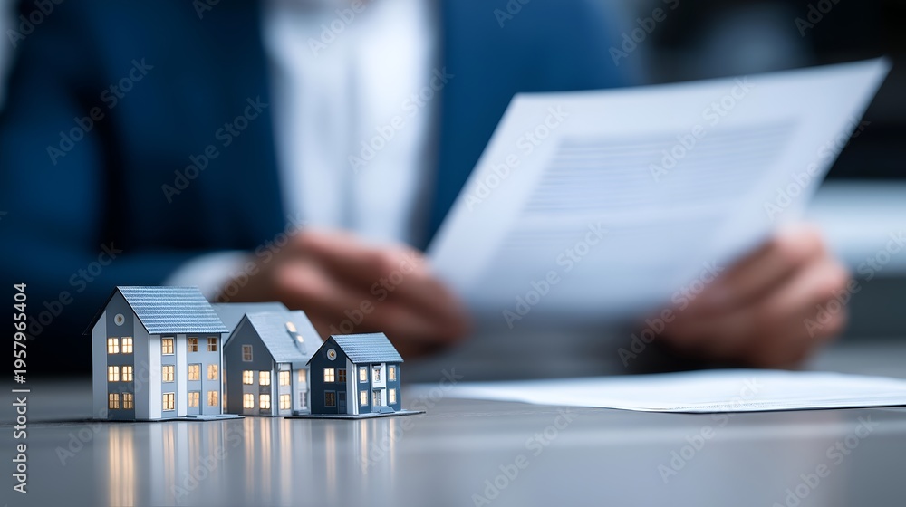 A businessman reviews documents with miniature houses, symbolizing real estate investment and property management. #1957965404