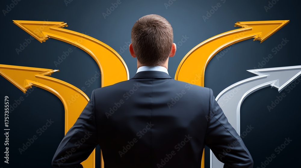 A businessman stands facing multiple directional arrows, symbolizing choices and decision-making in a professional environment. Ideal for concepts of leadership and guidance. #1757355579