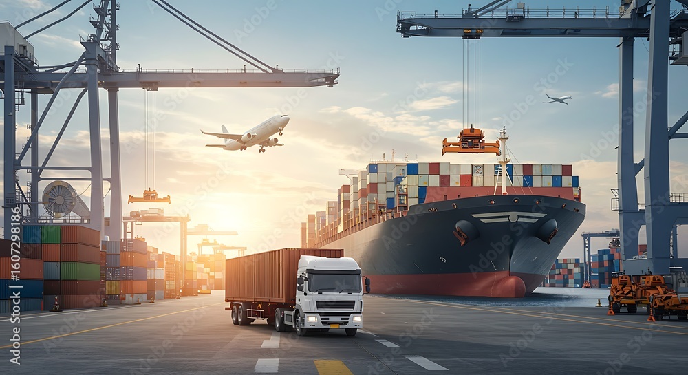 A busy port scene showing a cargo ship, truck, airplane, and several shipping containers and cranes #1607298186