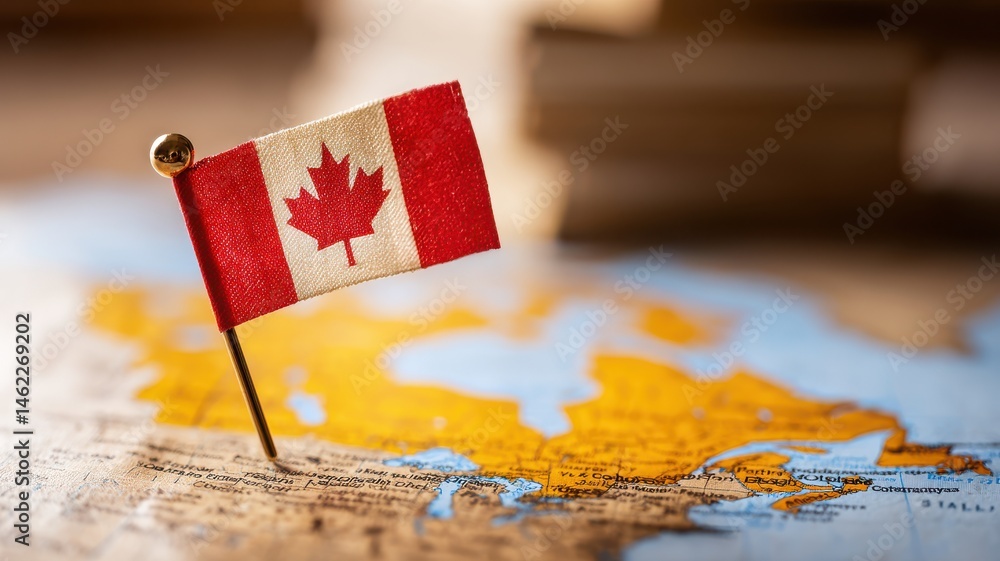 A Canadian flag pin marks its location on a map, symbolizing national pride and geography. #1462269202