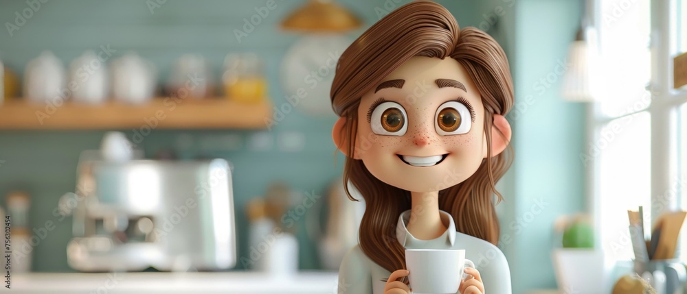 A cartoon 3D cute girl character having a coffee break with a tiny coffee cup #756302454