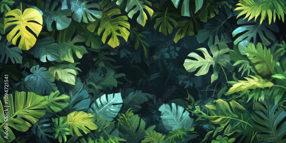 A cartoon picture of jungle vines and leaves makes a frame. It shows tropical plants like ivy and monstera. #1094721541