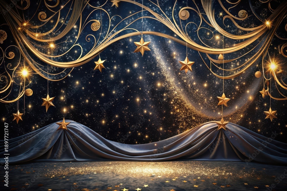 A Celestial Stage Setting with Draped Fabric and Golden Stars Hanging from Ornate Swirls Against a Glittering Night Sky Backdrop #1897721747