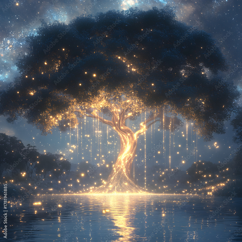 A celestial tree emits glowing light like water from its canopy, flowing downward into a mirror lake below. The entire scene is bathed in the soft glow of the Milky Way. #1781961885