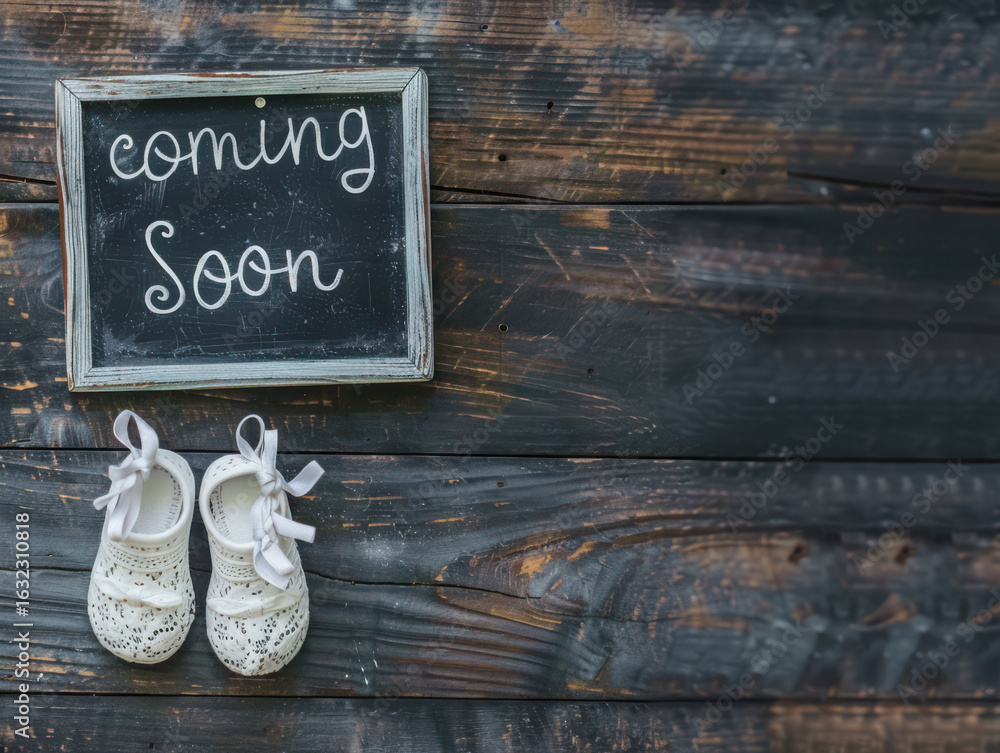 A chalkboard sign reading coming soon with baby shoes on a dark wooden textured surface background #1632310818