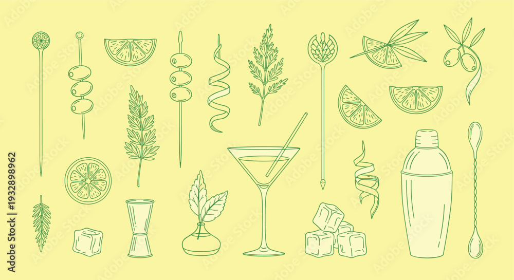 A charming collection of hand-drawn cocktail ingredients and bar tools presented on a soft yellow background #1932898962