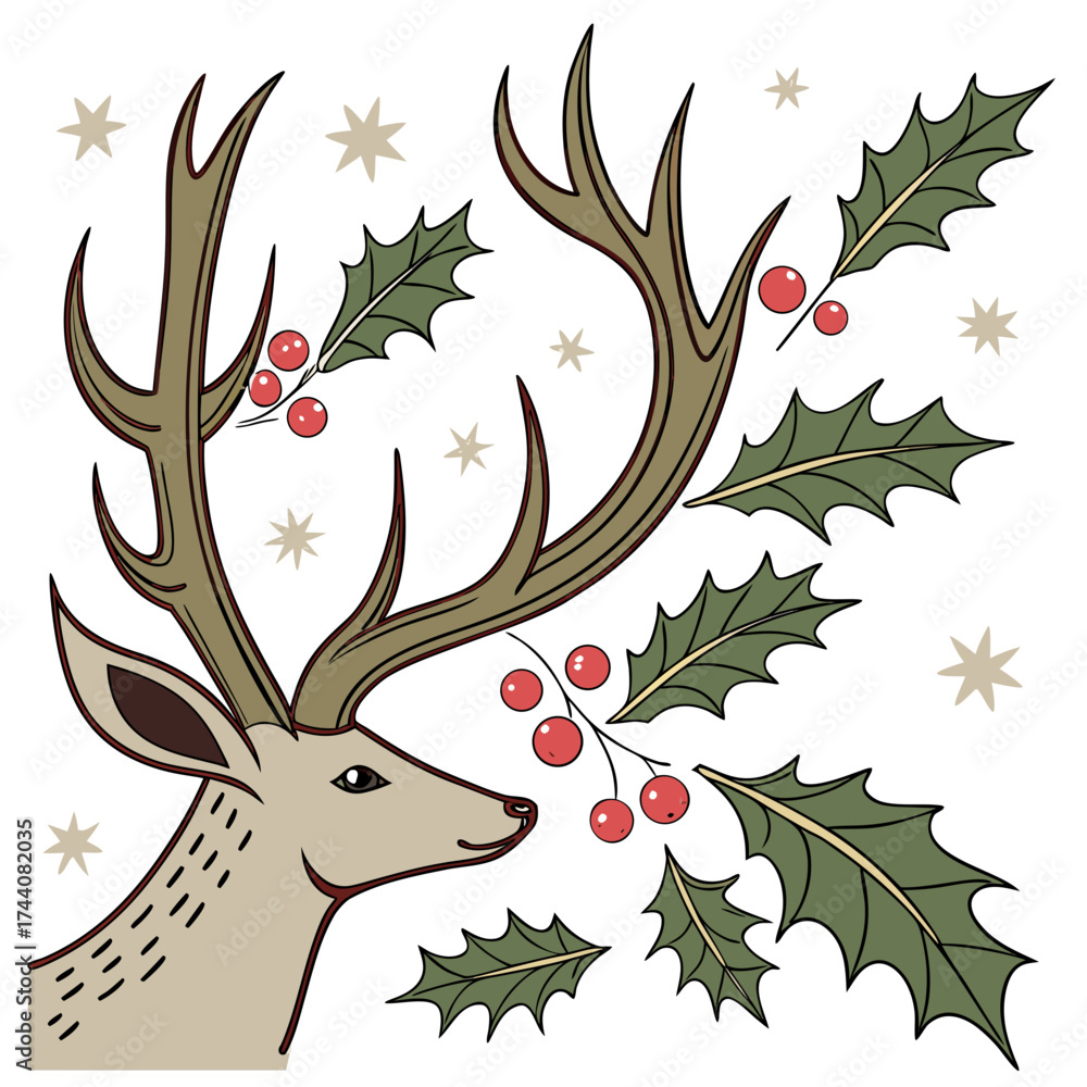 A charming illustration of a stag s head adorned with festive holly branches and berries surrounded by subtle starbursts evoking a whimsical winter holiday theme #1744082035