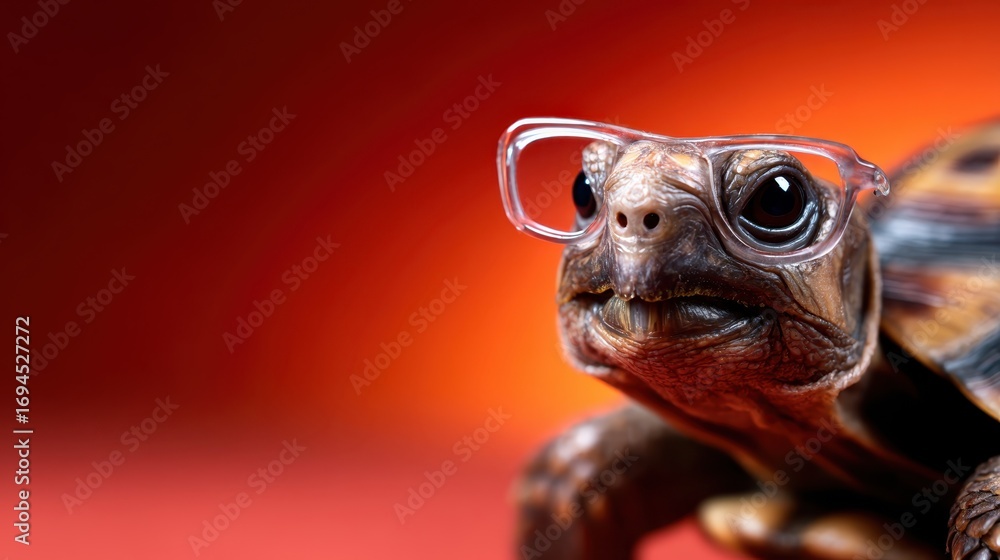 A charming turtle wearing stylish glasses poses against a vibrant, warm background, showcasing its character and adding a humorous touch to nature photography. #1694527272