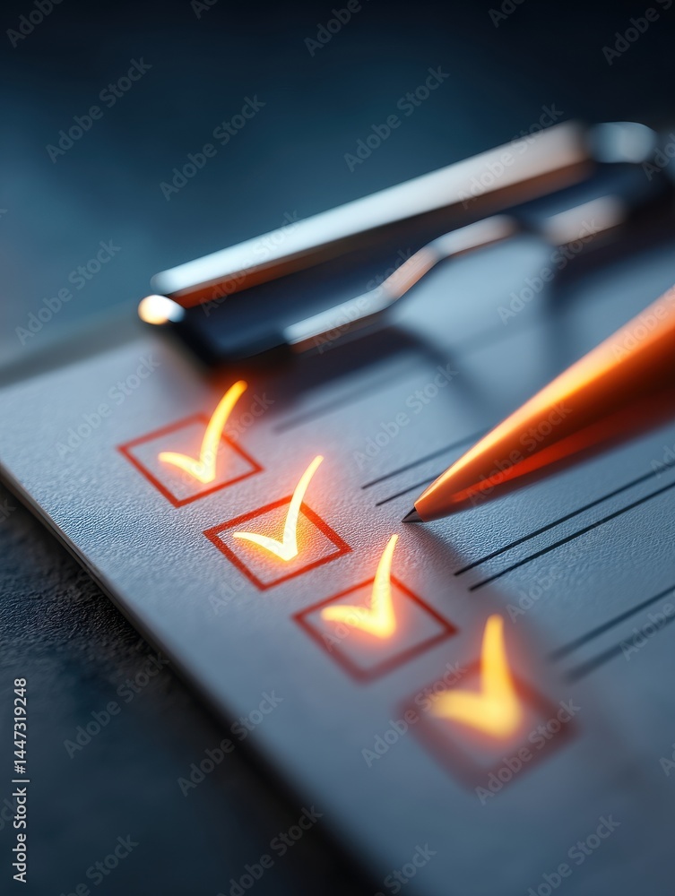 A checklist with glowing checkmarks being marked by a pen, symbolizing completed tasks and organization. #1447319248