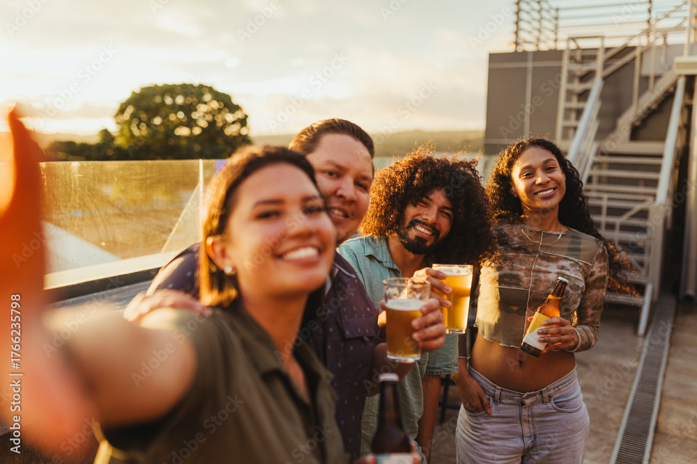 A cheerful group of friends takes a selfie while enjoying cold beers on a rooftop during golden hour. #1766235798