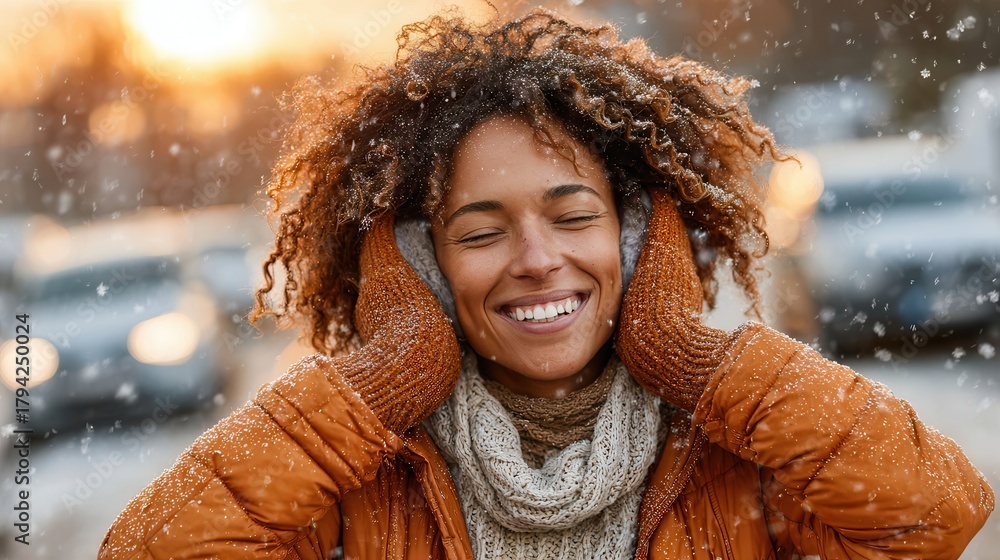 A cheerful woman adjusting her earmuffs while wearing layered winter clothing with a puffer jacket lined leggings and sleek leather gloves as snowflakes fall softly in a serene cold weather street sce #1794250024