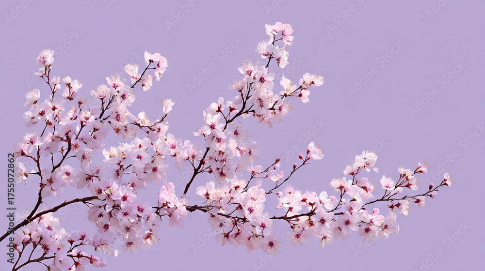 A cherry tree in bloom with its branches against a purple and lilac backdrop, and the blue sky visible behind #1755072862