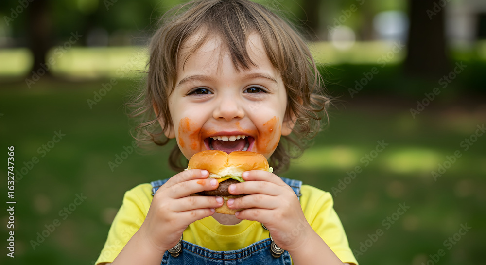 A child happily biting into a small slider burger, with ketchup on their cheek #1632747366