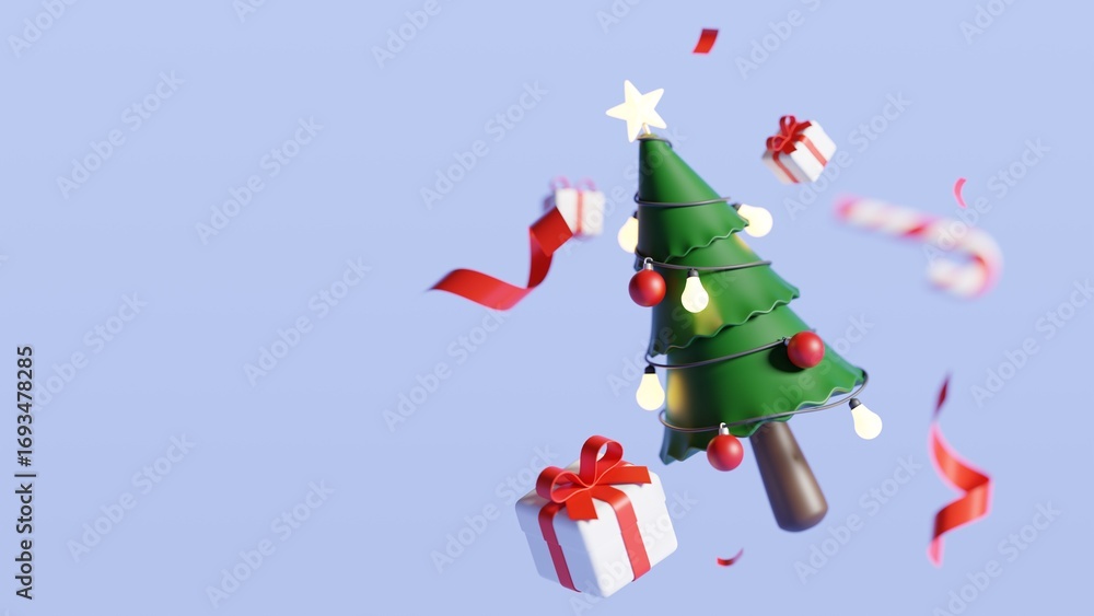 a christmas tree with gift box and collection of christmas elements on blue background. 3d rendering #1693478285