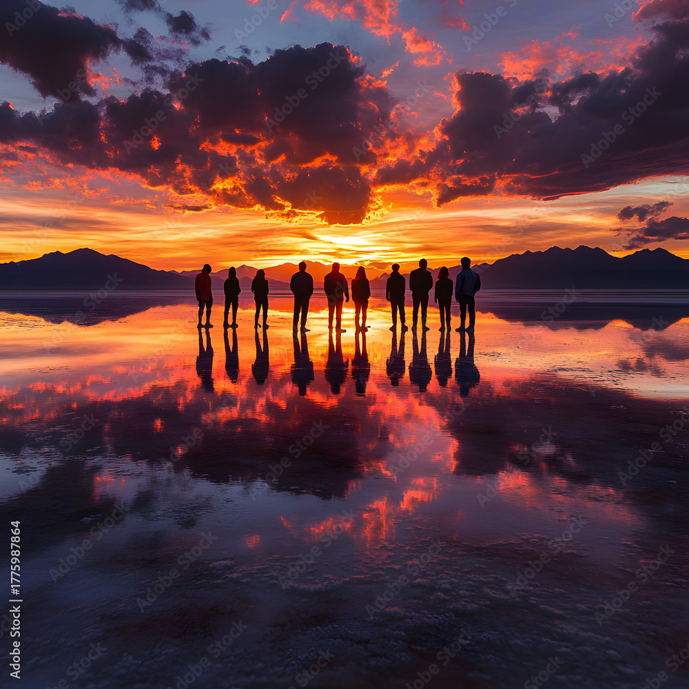A cinematic group photograph by shimmering salt flats at sunset, glowing golden water reflecting pink and orange clouds, silhouettes of people blending into the expansive horizon, #1775987864