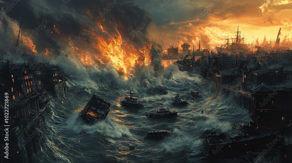 A city engulfed in flames, ravaged by a massive storm, with ships tossed about in the violent waves, while a lone figure stands on a wave, defying the chaos. #1022721869