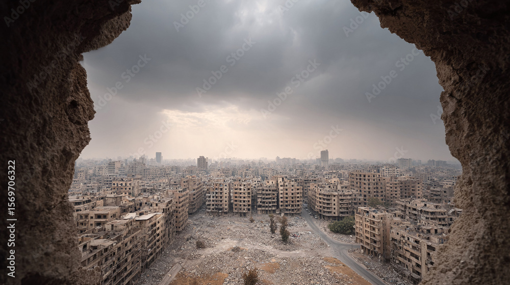 A city in ruins viewed through a stone archway. Evokes themes of destruction, conflict, resilience, and aftermath. Could be used for documentary, news, or conceptual projects. #1569706322