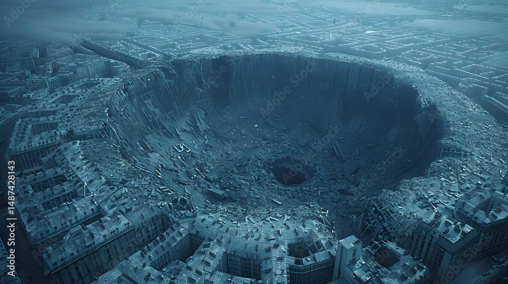 A city ravaged by a catastrophic event, with a large crater and scattered rubble, yet signs of life remain amidst the devastation. #1487428143