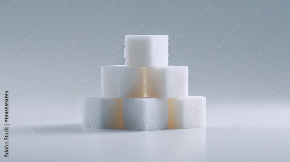 A clean and minimalistic stack of white sugar cubes on a soft gray background, ideal for food-related articles, health discussions, or product packaging designs, #1941893095