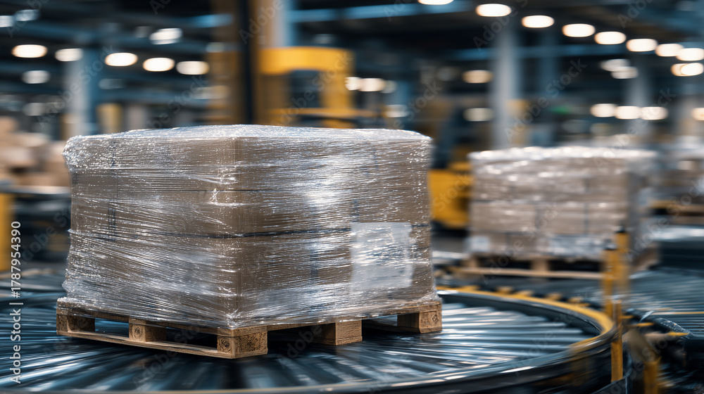 A clean organized warehouse setting where an automated wrapping machine spins pallets, stretchwrap film stretched thin and tight, strong highlights accentuating film pressure and s #1787954390