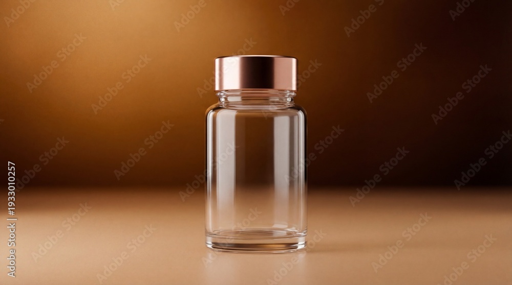 A clear glass bottle with a copper cap sits on a beige surface against a warm brown background. #1933010257