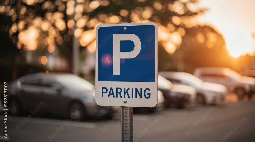 A close-up of a blue and white parking sign with blurred cars and warm sunset lighting in the background. #1928131107