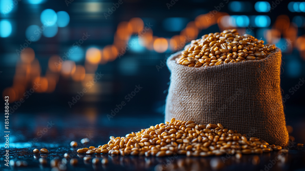 A close-up of a burlap sack overflowing with grains on a surface, highlighted by a blurred, colorful background of market data #1814388043