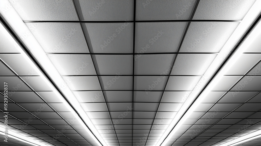 A close up of a ceiling in an office building features gray grid tiles and white fluorescent lights with rectangular LED strips creating a stark contrast. #1929352837