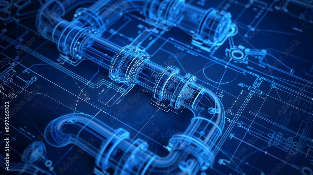 A close-up of a detailed blueprint with glowing pipes symbolizing innovation, technology, connection, progress, and efficiency. #897565102