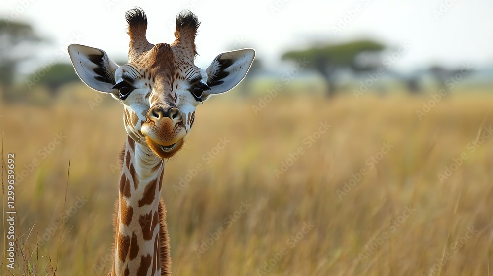 A close-up of a giraffe smiling in a lush African savanna, surrounded by golden grasses and sparse trees, showcasing its long neck and distinctive patterns #1299639692