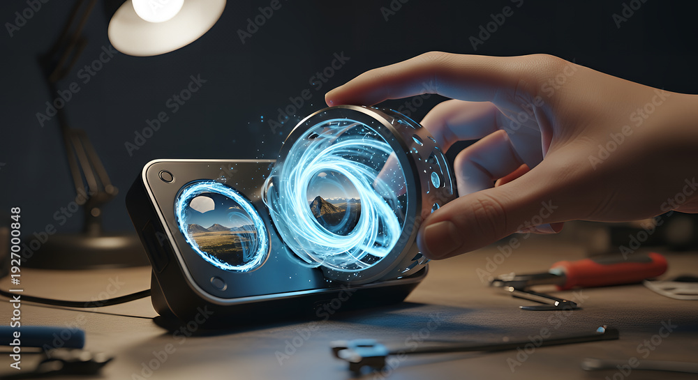 A close-up of a hand holding an old digital hard drive while a man uses computer hardware equipment for data storage in a retro technology macro photography shot #1927000848