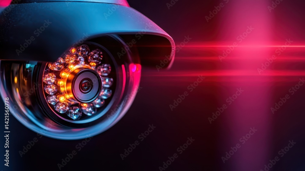A close-up of a high-tech security camera with vibrant LED lights, highlighting its advanced features in a modern, dark setting, perfect for surveillance and security purposes. #1421560778