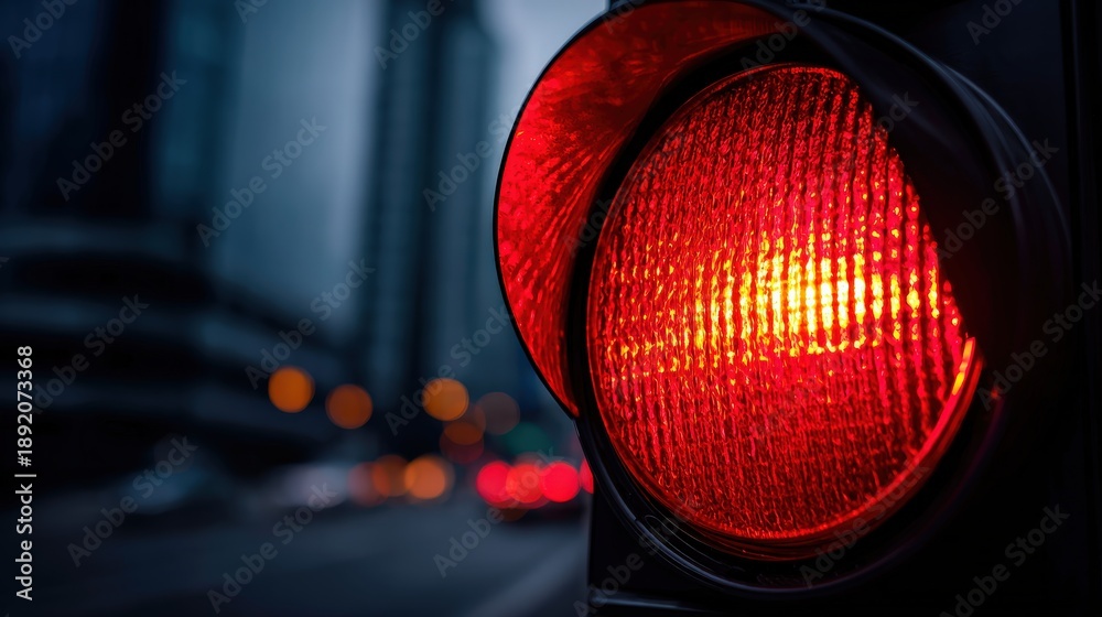 A close-up of a red traffic light glowing against a blurred city backdrop, signaling for vehicles to stop in a bustling urban environment. #1892073368