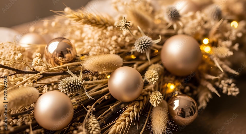 A close-up of a rustic and elegant Christmas wreath made with dried grasses, thistles, and champagne-colored baubles with warm lights. #1771767250