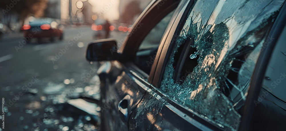 A close-up of a shattered car window with debris on the street, capturing the aftermath of an accident. #1777750283