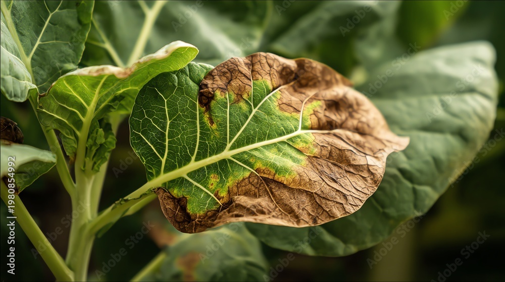 A close-up of a wilted leaf showcasing its unique texture and color variations. The image highlights the natural aging process and the beauty of plant life even in decline. #1980854992