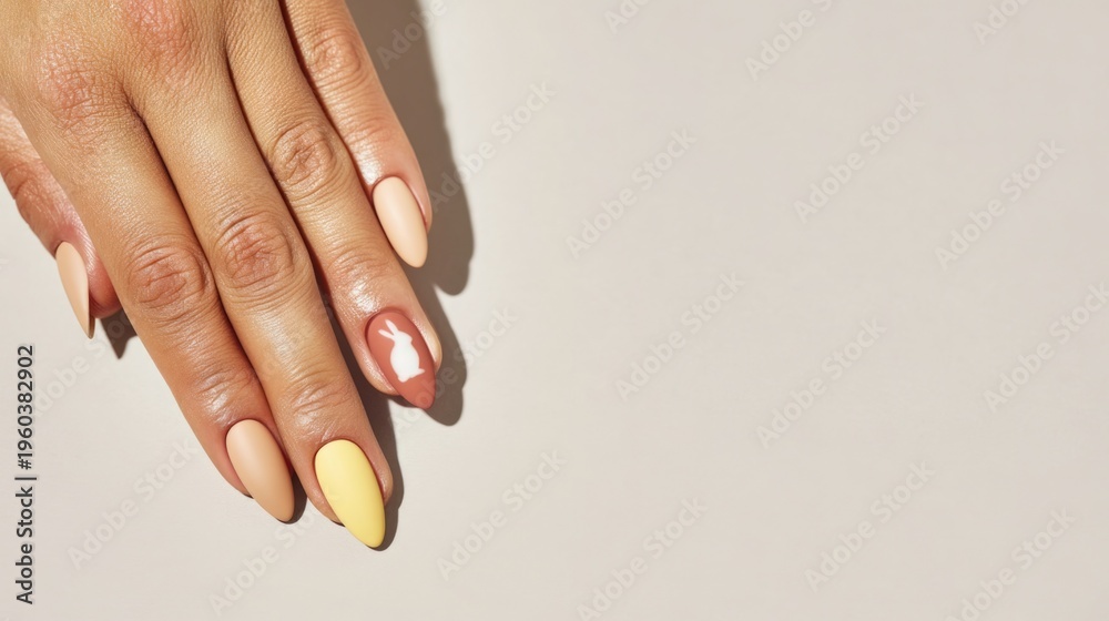 A close-up of a woman's hand with long, almond-shaped nails. The nails are painted in pastel colors, including yellow and a nude shade. The background is neutral. #1960382902