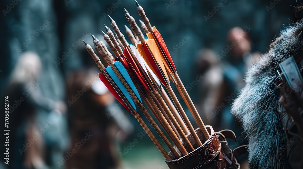 A close-up of an archer's quiver filled with colorful arrows, set against a blurred outdoor scene of medieval characters, Ideal for themes of archery, fantasy, adventure, or historical reenactment, #1705662174