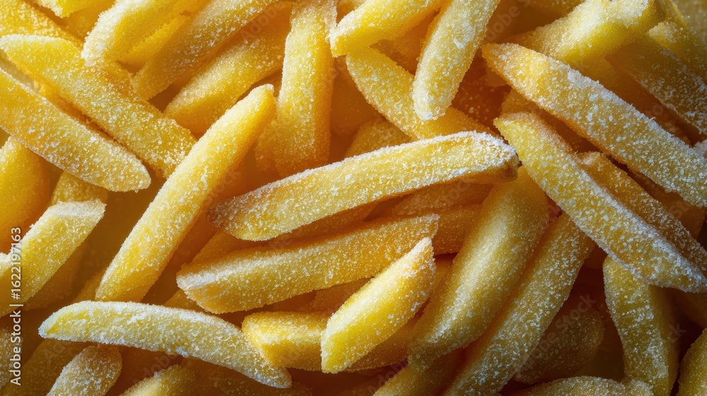 A close-up of frozen french fries, ready to be fried and enjoyed. Perfect for illustrating fast food, snacks, or cooking concepts. #1622197163