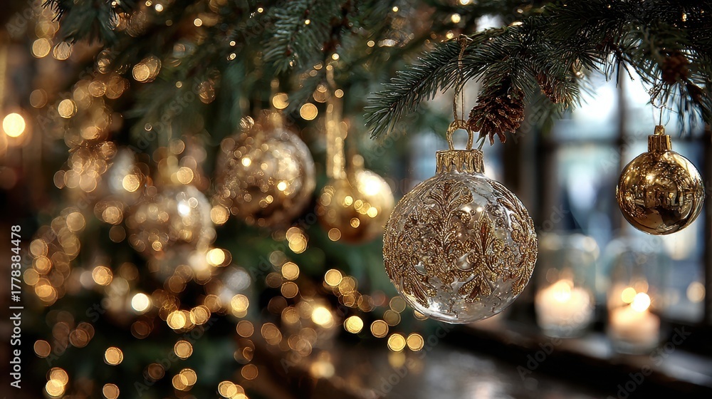 A close up of golden ornaments hanging from a fir branch with reflections of twinkling lights creating a luxurious and elegant Christmas atmosphere #1778384478