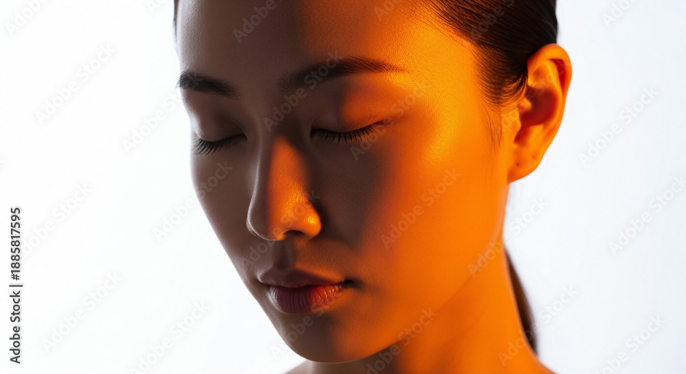 A close-up portrait of a woman with closed eyes and a soft, warm glow of light on her face #1885817595