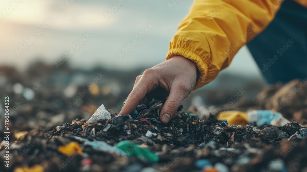 A close up shot of a hand reaching down to pick up waste and litter from a polluted littered environment #1786064323